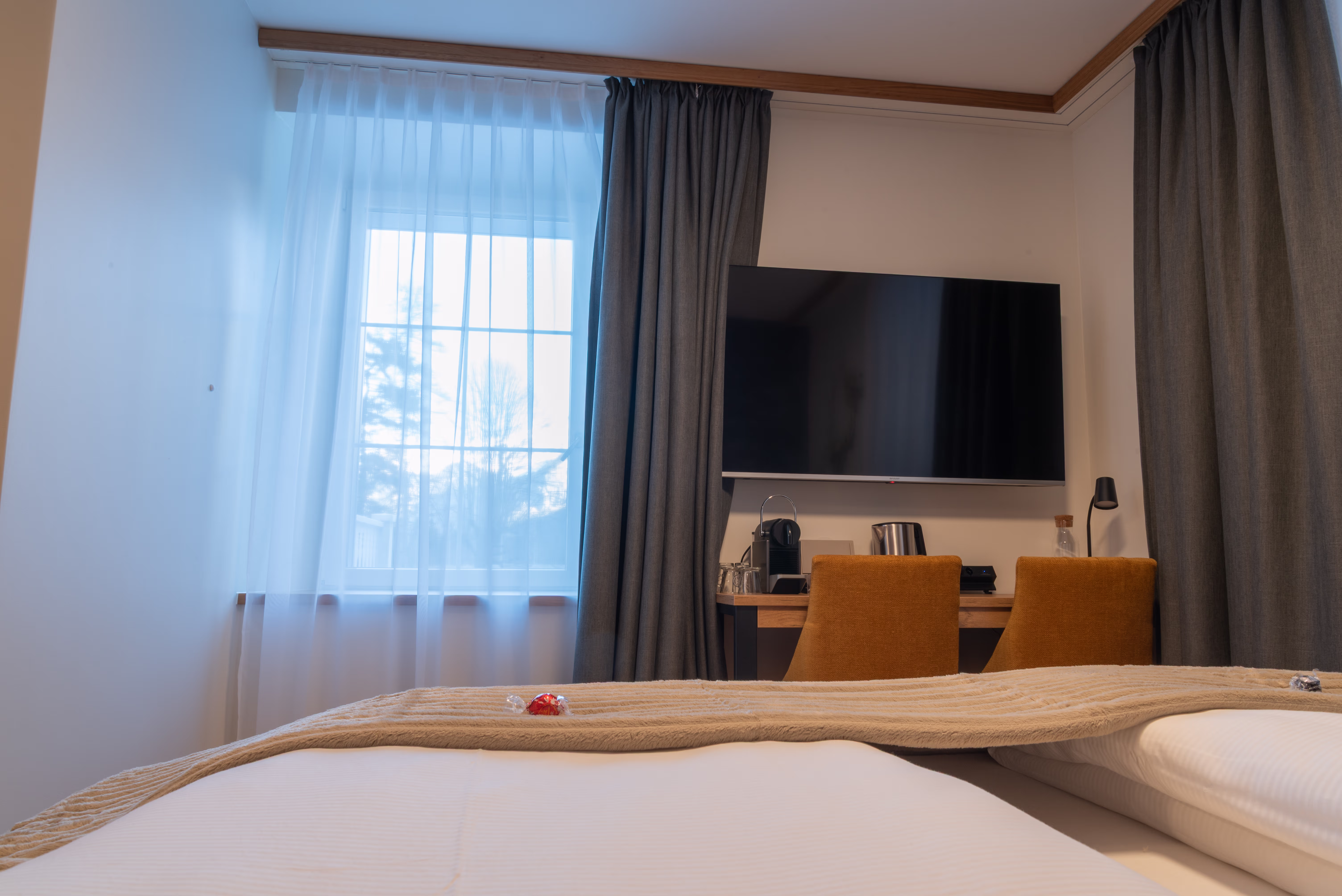 Spacious rooms with a balcony with views of the picturesque mountain scenery. They are equipped with modern box-spring beds and a bathroom with a spacious shower. A television and a Nespresso machine are among the additional amenities. Each room features a work of art by Carl Röhrig.